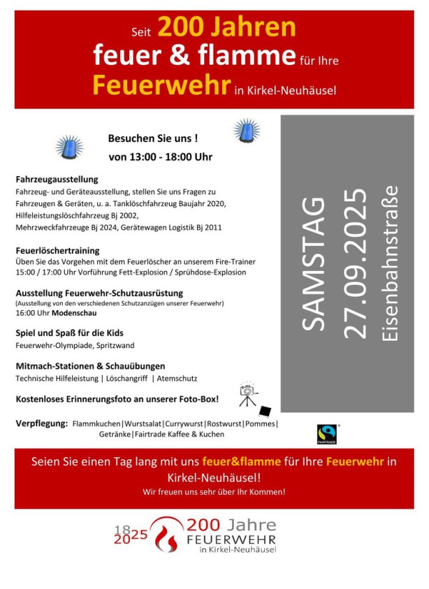 Mit den Feierlichkeiten blickte die Feuerwehr Kirkel-Neuhäusel nicht nur auf ihre 200-jährige Geschichte zurück, sondern unterstrich zugleich die Bedeutung des ehrenamtlichen Engagements für die Sicherheit der Bevölkerung. Der Leitspruch „Gott zur Ehr, dem Nächsten zur Wehr“ prägt die Arbeit der Wehr seit zwei Jahrhunderten – und soll auch in Zukunft Richtschnur für das Handeln der Kameradinnen und Kameraden bleiben. (jj)