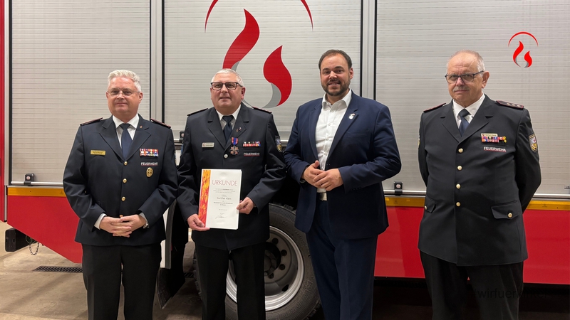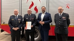 Eine besondere Ehrung erhielt Wehrführer Gunther Klein. Er wurde vom Deutschen Feuerwehrverband mit dem Feuerwehrehrenkreuz in Bronze ausgezeichnet. Die Ehrung wurde durch Gerhard Sauer, Vizepräsident des Landesfeuerwehrverbandes, und Manfred Metzinger, Präsident des Kreisfeuerwehrverbandes, überreicht.