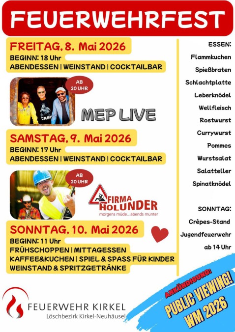 IVom 8. bis 10. Mai ist es wieder soweit. Der Löschbezirk Kirkel-Neuhäusel lädt zum Feuerwehrfest ein. Am Freitag und Samstag erwartet Euch Live-Musik ab 20 Uhr sowie Abendessen, Cocktailbar und Weinstand. Am Sonntag starten wir ab 11 Uhr mit Frühschoppen, Mittagessen,